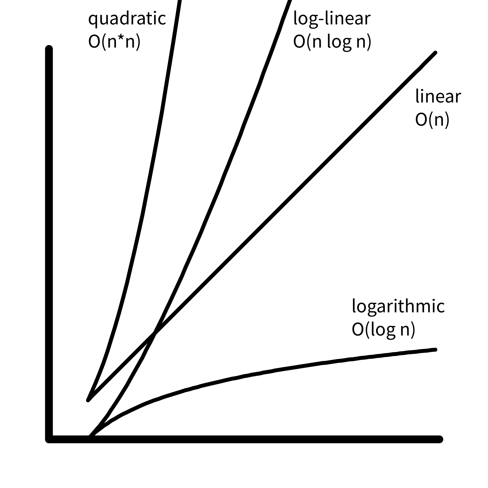 Because the graph of \(f(n) = n\) is a line, if an algorithm is \(O(n)\), we say it is “linear in time complexity”. If an algorithm is \(O(1)\), the number of computations is bounded by a constant, and we say the algorithm has “constant time complexity”.